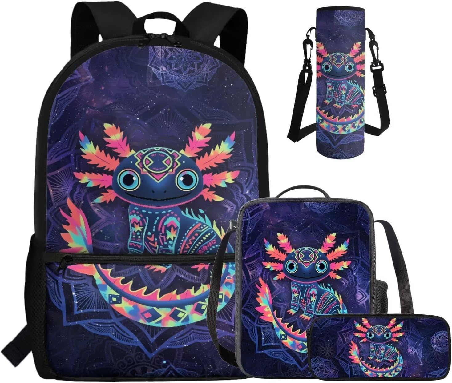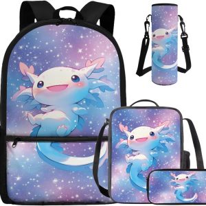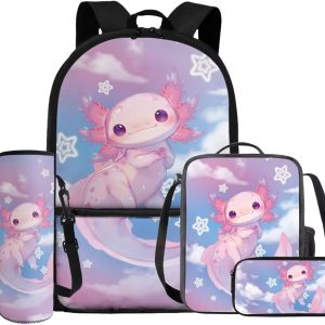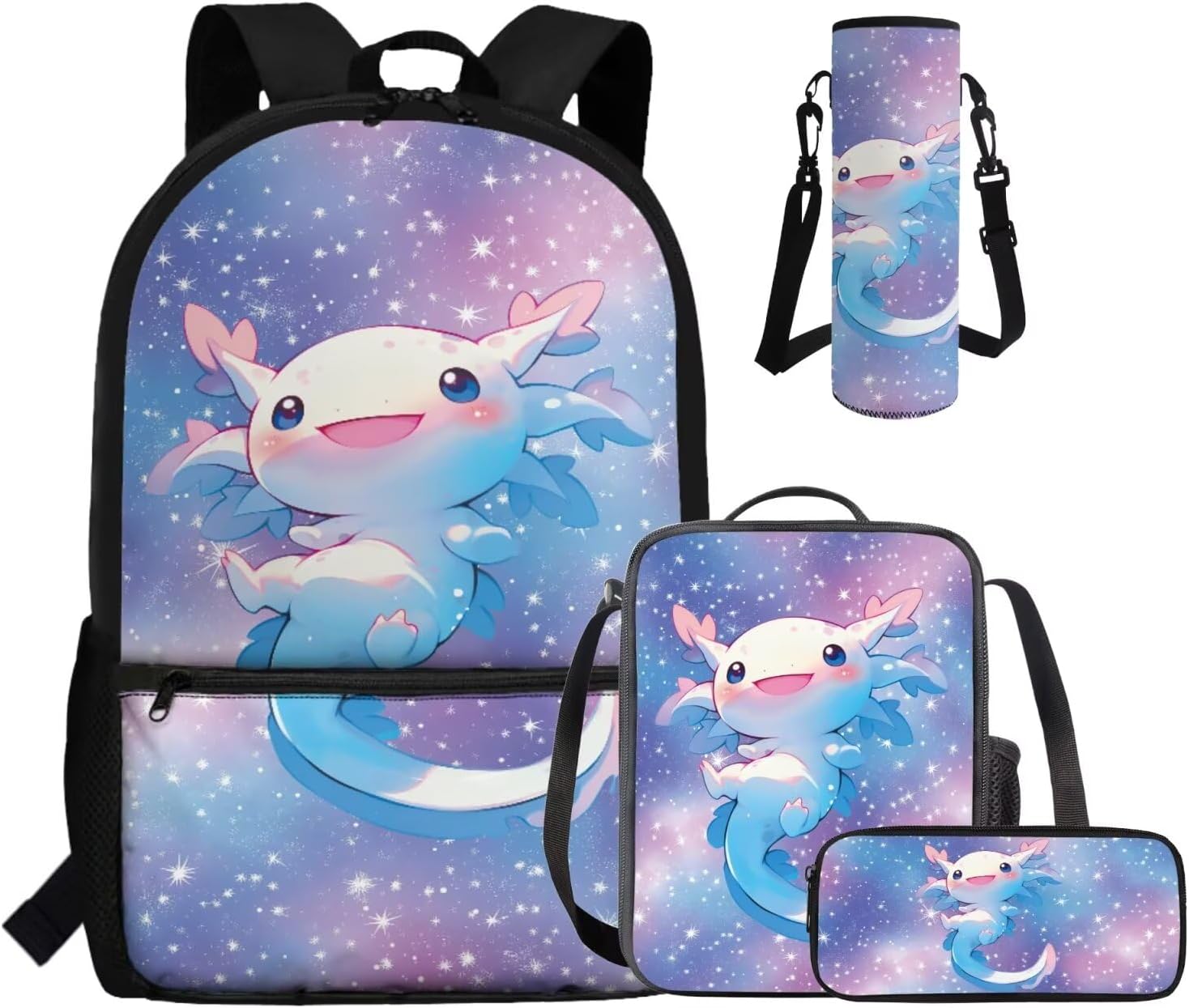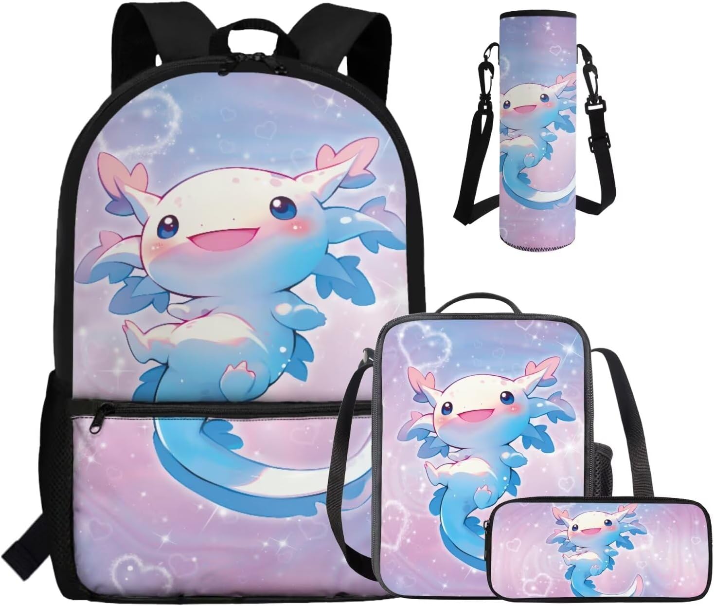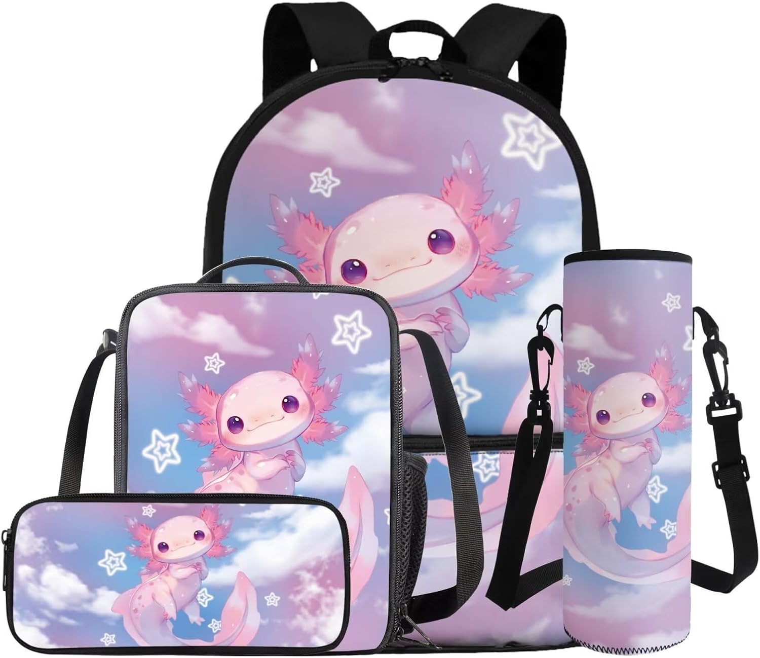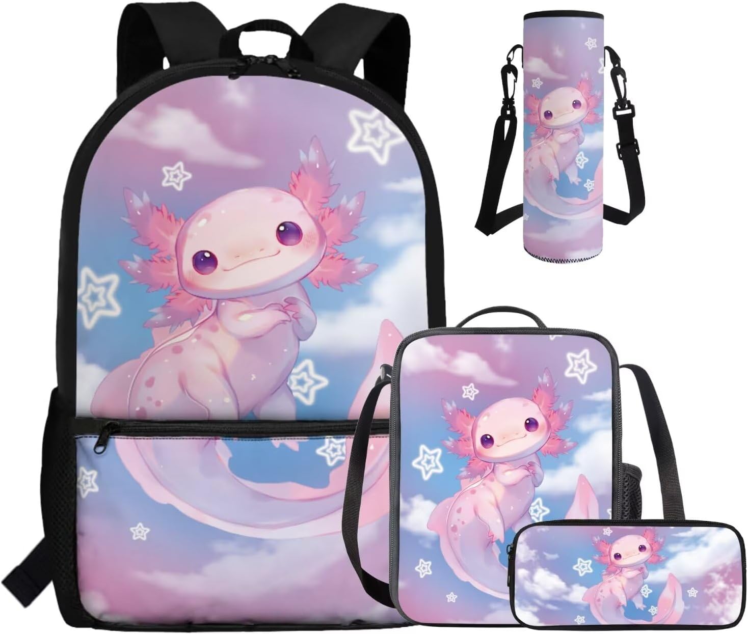 COEQINE Girls Backpack with Water Bottle Pink Axolotl Stars Y2K for 8-10 Kawaii Bookbags Kids School Bag Set Lunch Box Pencil Case Sleeve Teens Purse