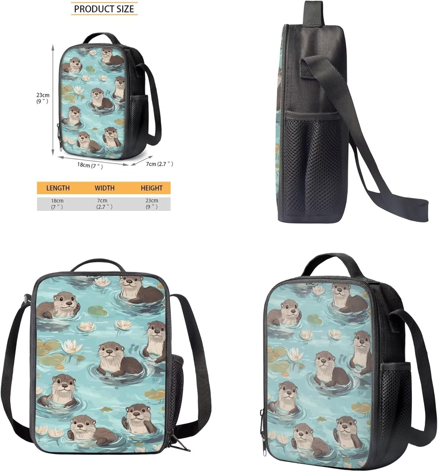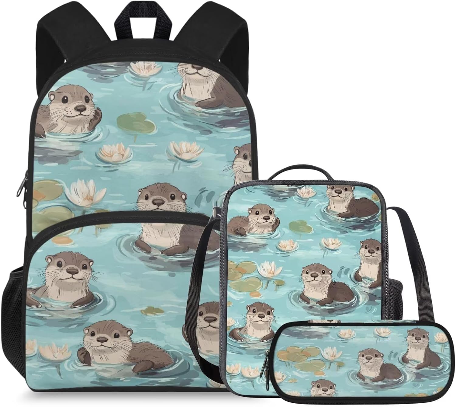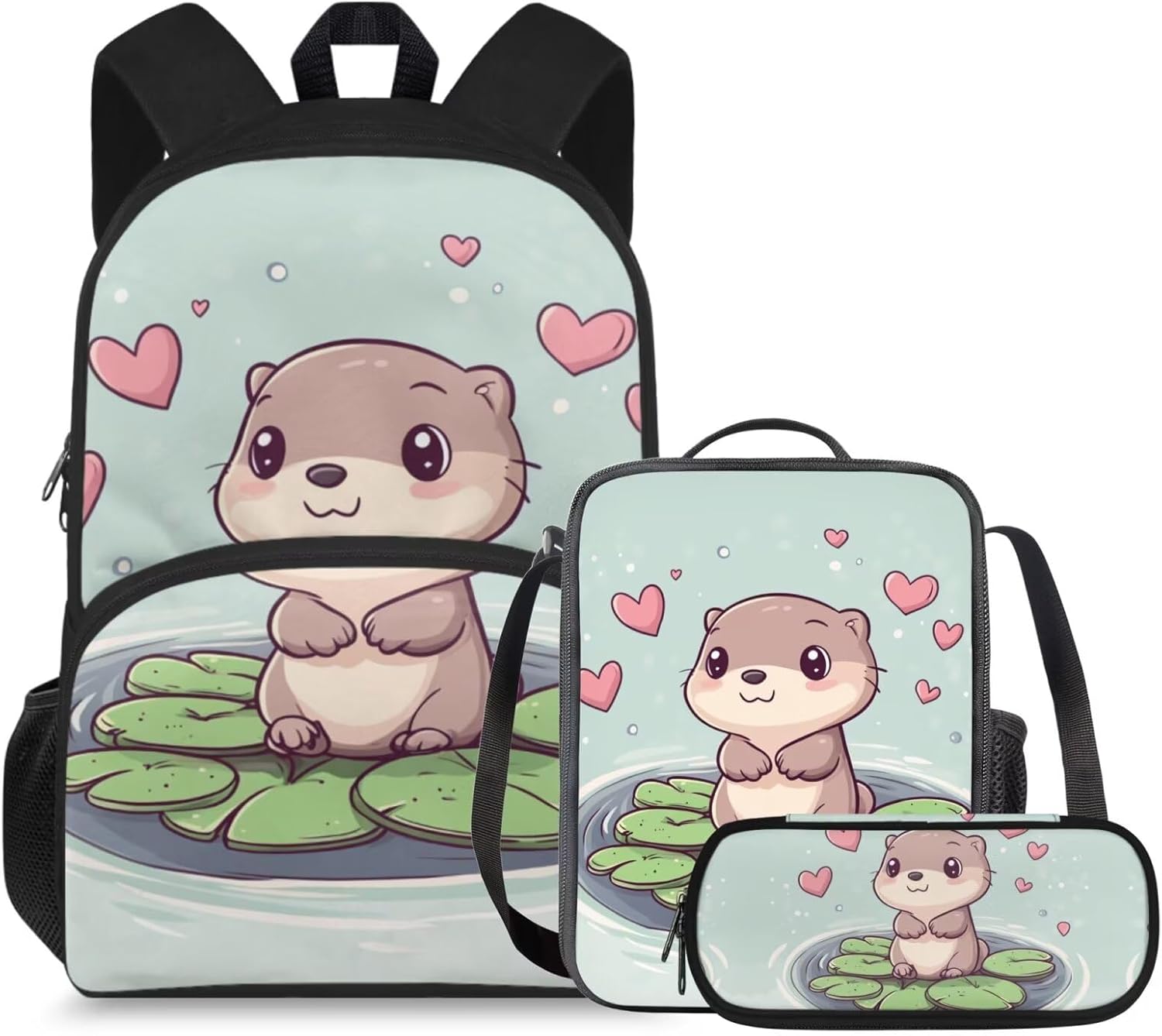 COEQINE Otter Backpack for Girls Kawaii Pre School Bookbag Set for Toddler with Lunch Box Strap Lightweight 3Pcs 15 Inch Book Bag for Kids 6-8 Year Large Penci Holder