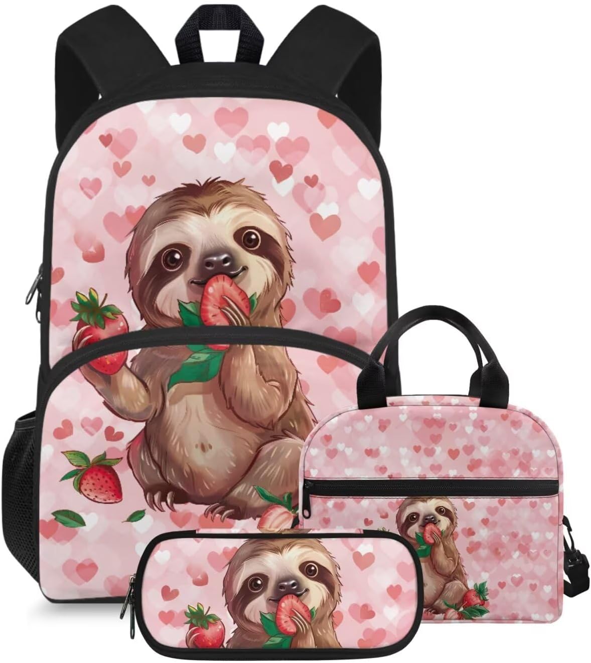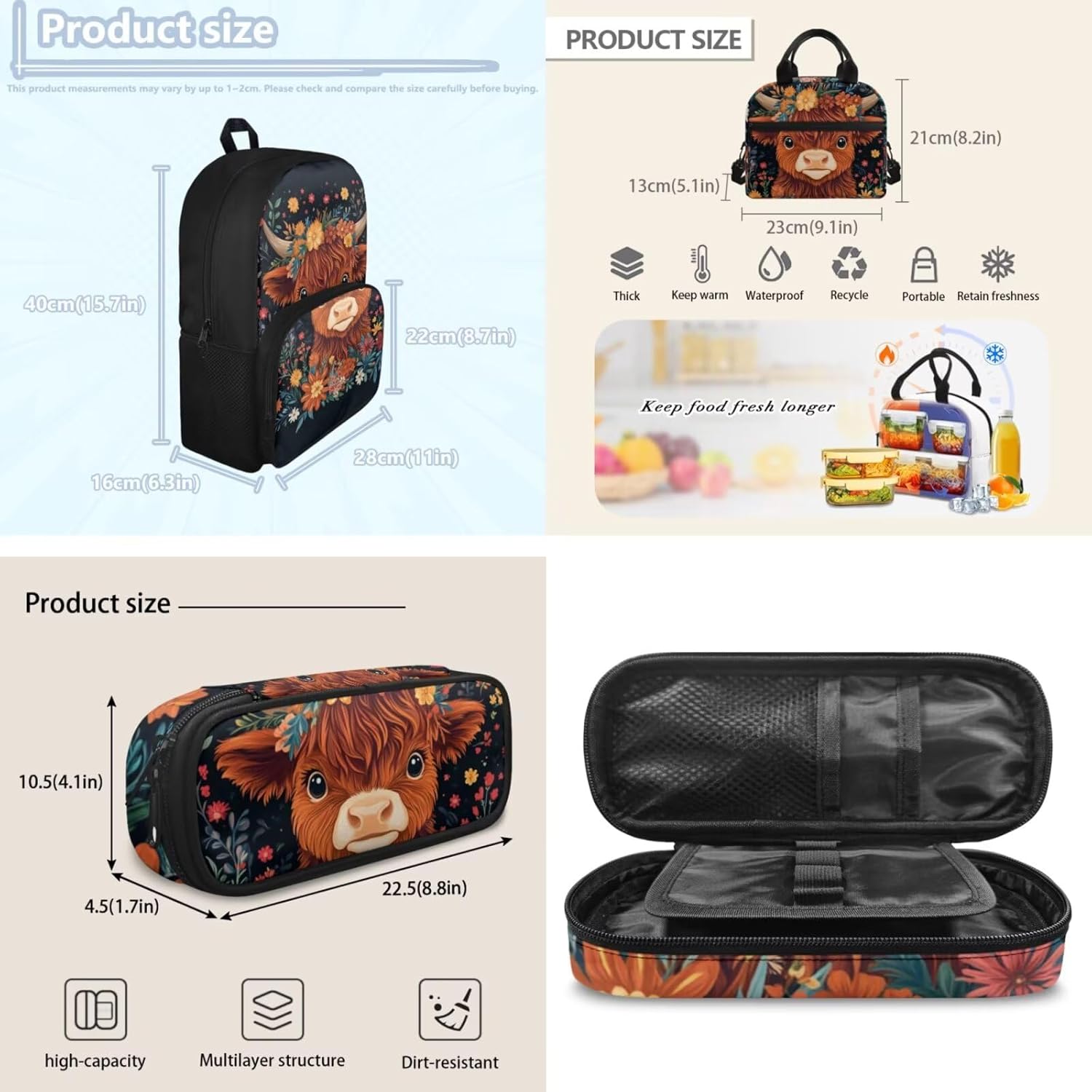 FOR U DESIGNS Girls Highland Cow School Backpack Set 15 Inch Lightweight Cartoon Bookbag with Lunchbox for Ages 6-8 Kawaii Kindergarten School Bag 2nd Grade