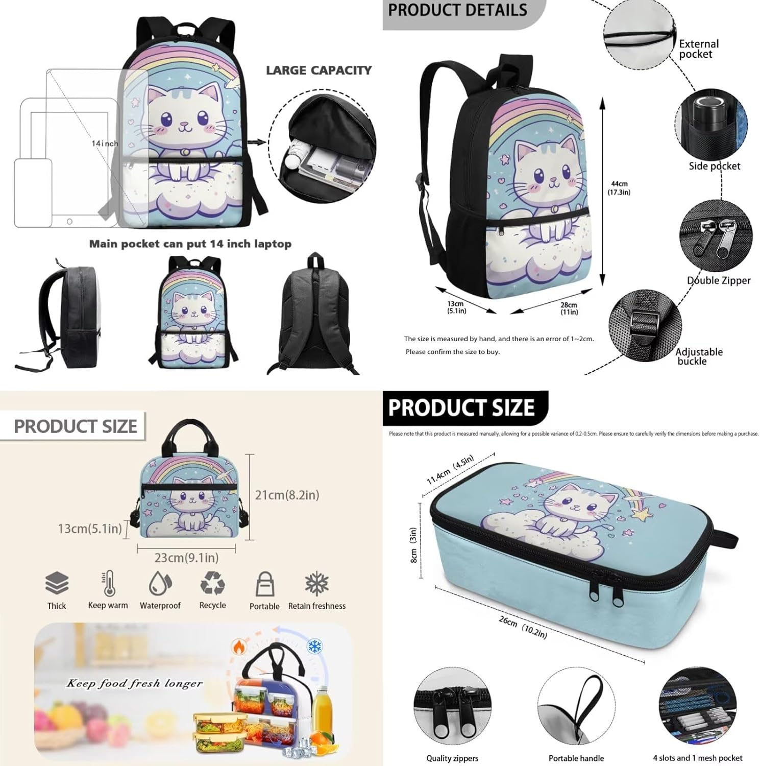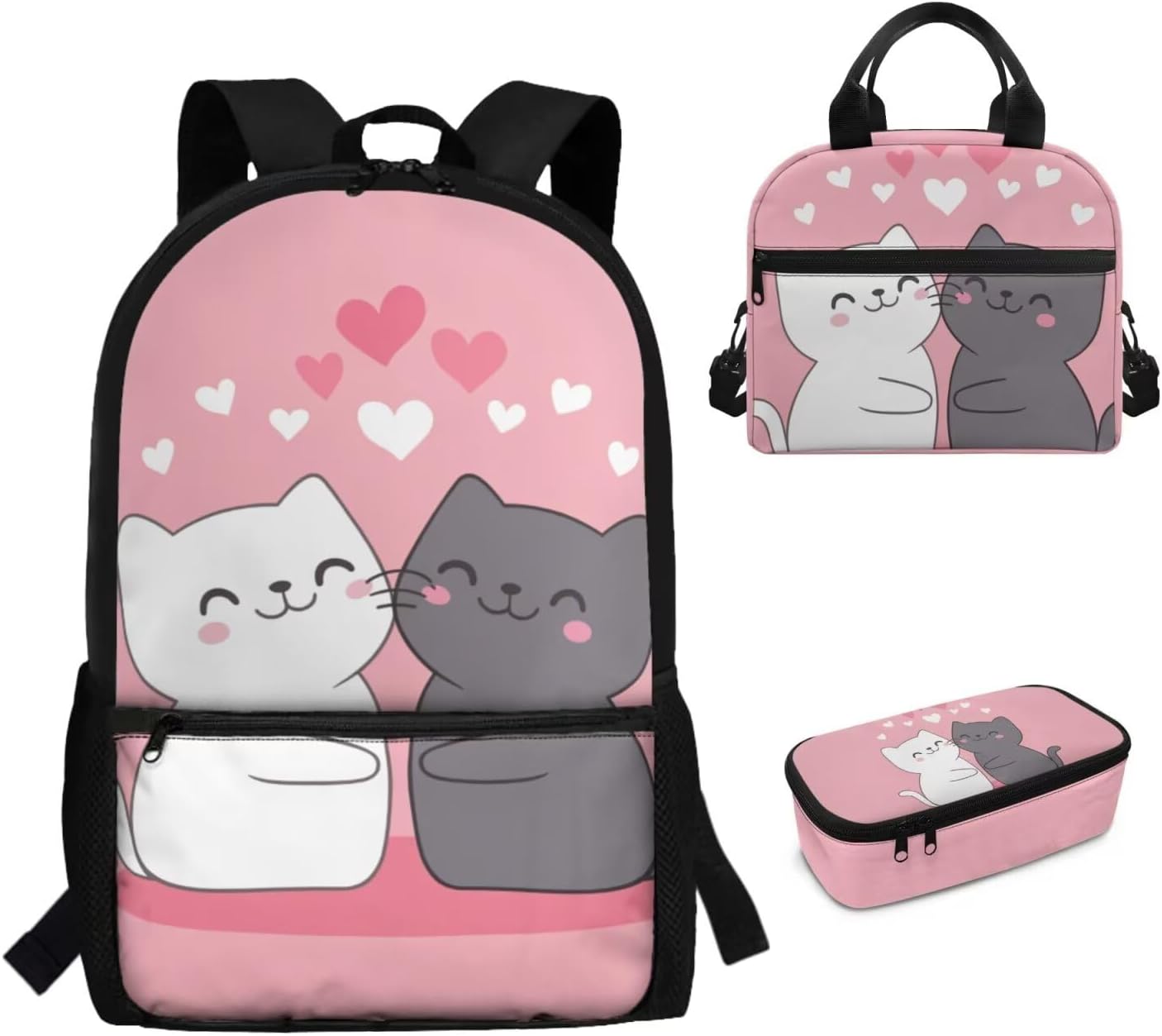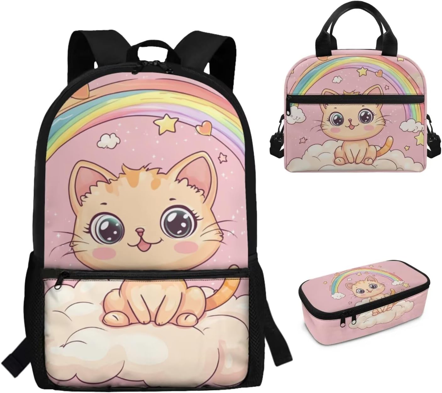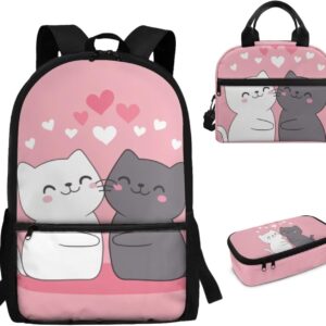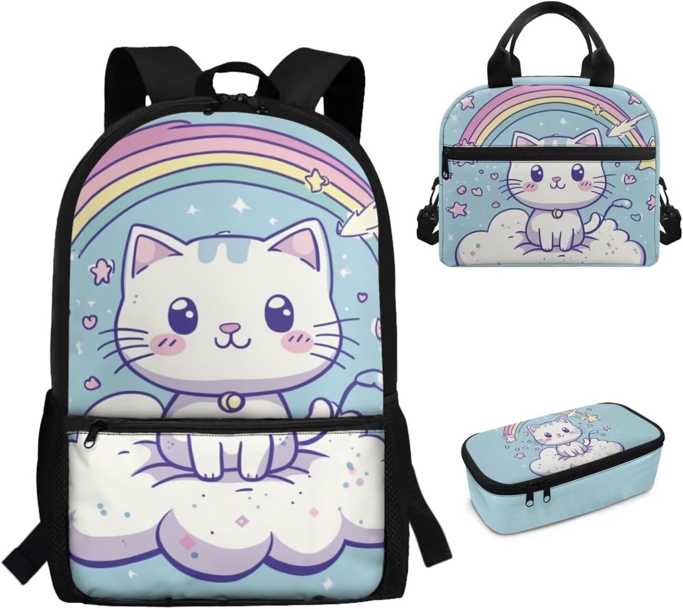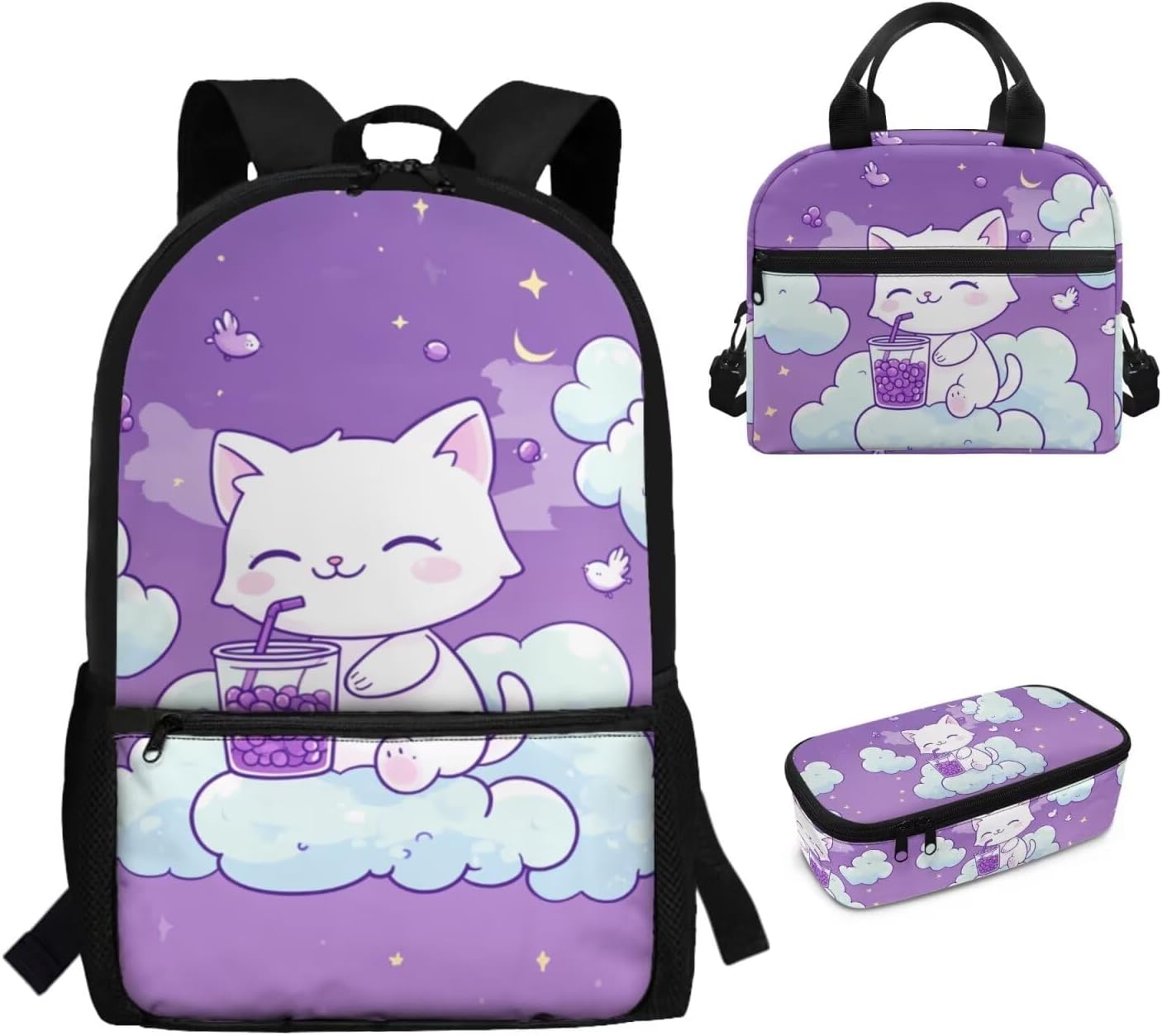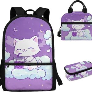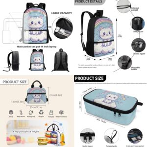 FOR U DESIGNS Kawaii Cat Pattern Backpack with Insulated Lunch Bag Zipper Pouch Ergonomic 17 Inch School Bookbag for Grade 3 Lightweight Backpack for Girls 8-12 quantity