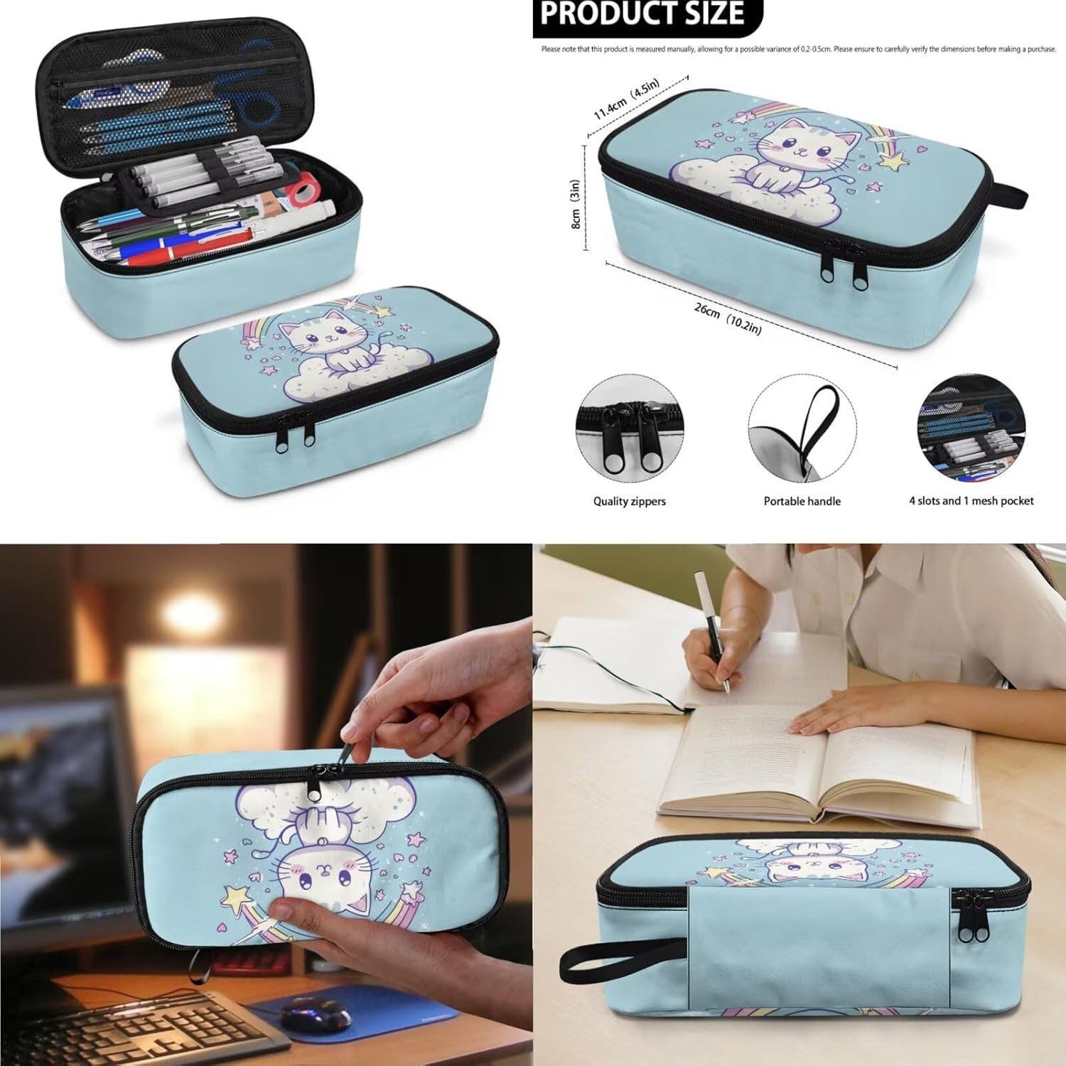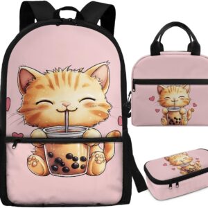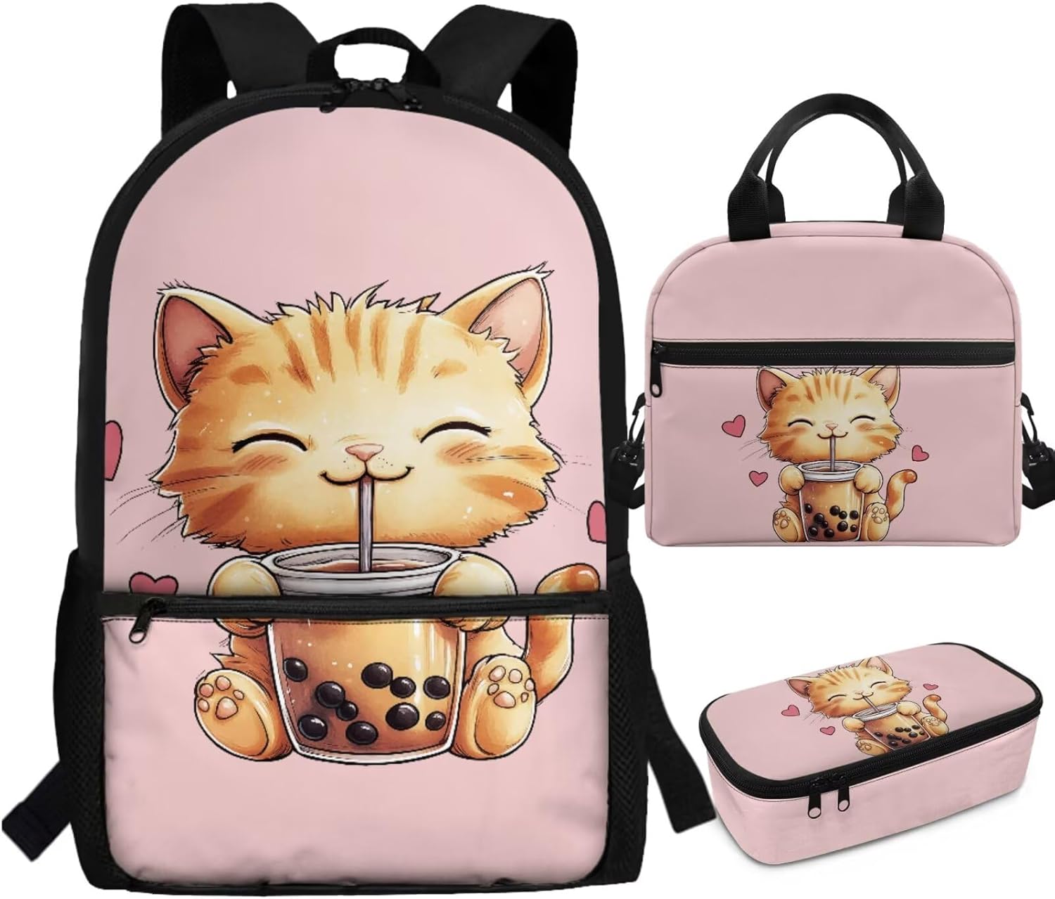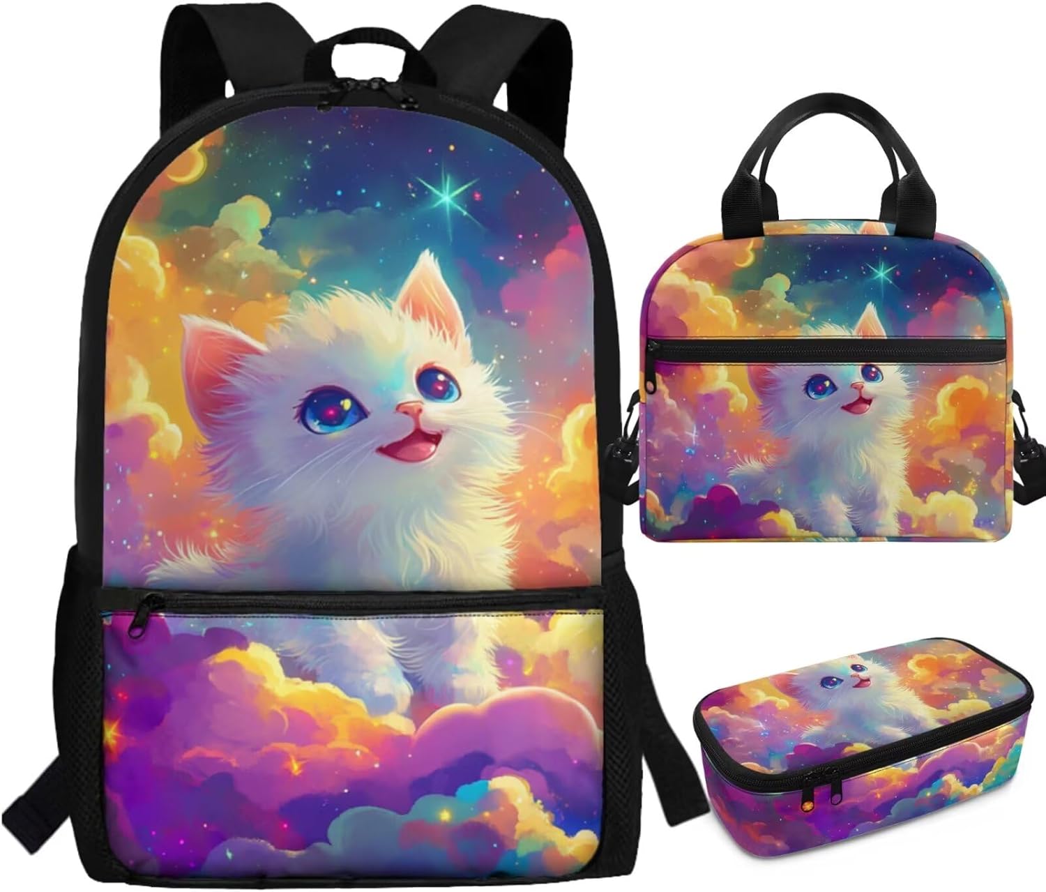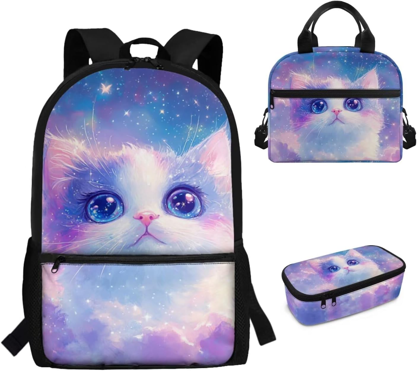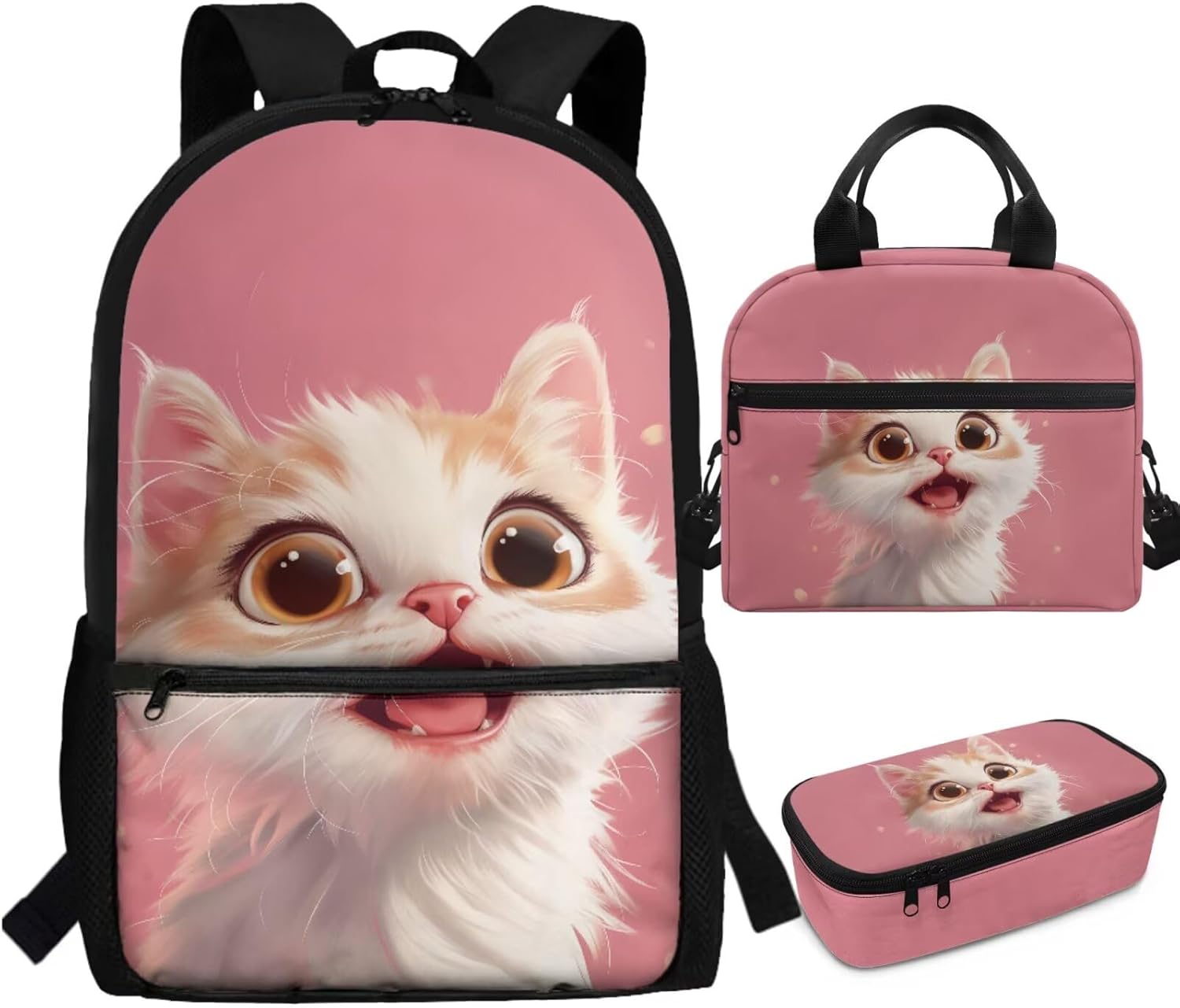 FOR U DESIGNS Kawaii Cat Pattern Backpack with Insulated Lunch Bag Zipper Pouch Ergonomic 17 Inch School Bookbag for Grade 3 Lightweight Backpack for Girls 8-12 quantity