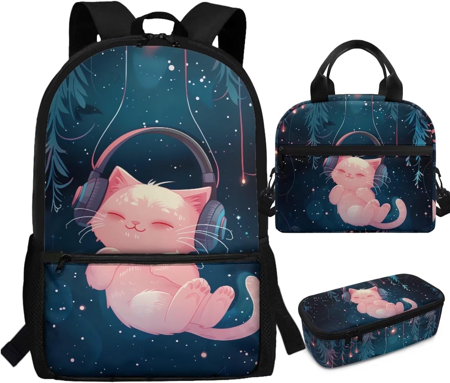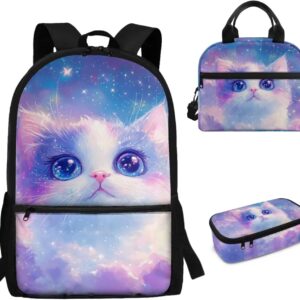 FOR U DESIGNS Kawaii Cat Pattern Backpack with Insulated Lunch Bag Zipper Pouch Ergonomic 17 Inch School Bookbag for Grade 3 Lightweight Backpack for Girls 8-12