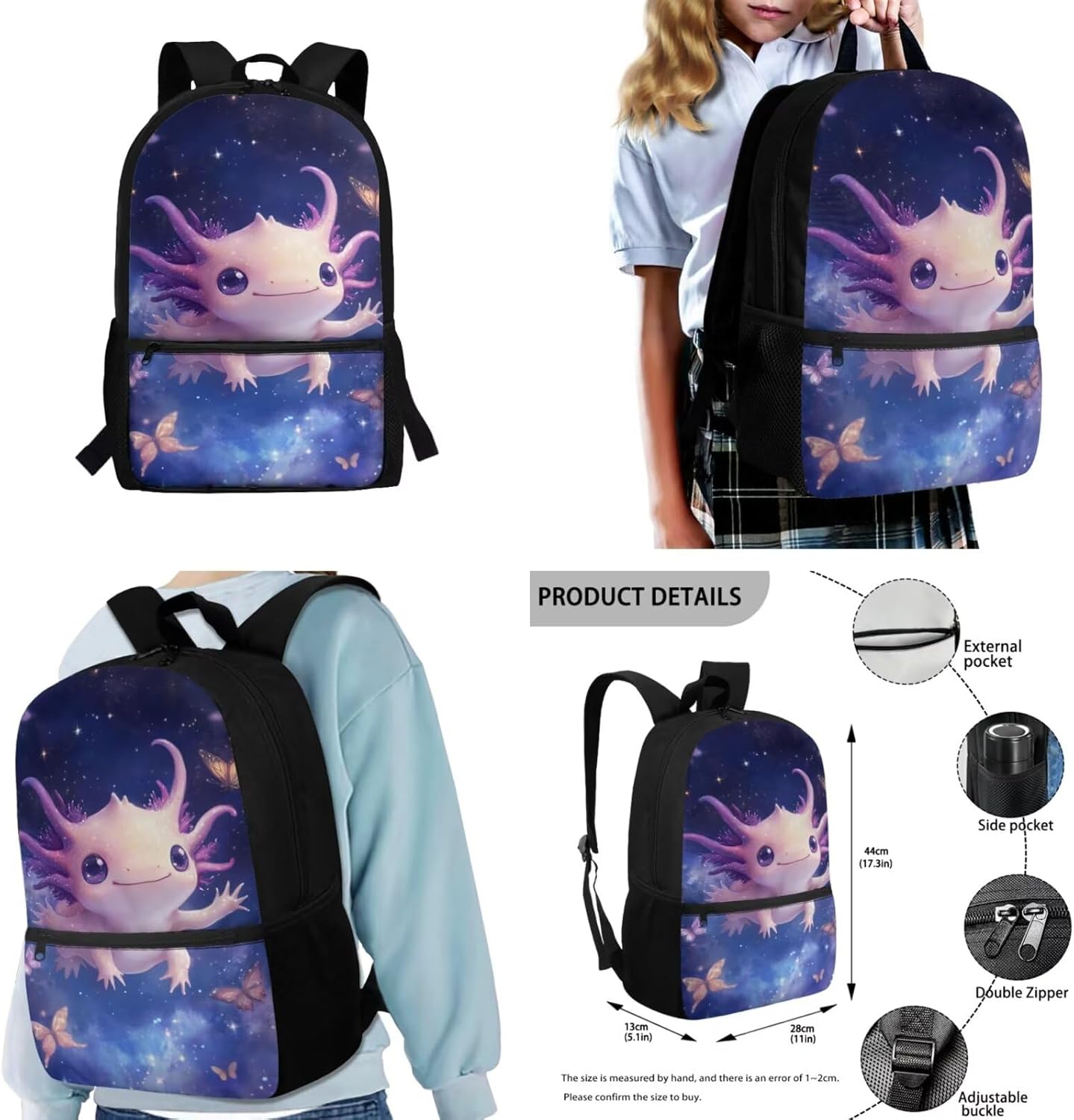 - 【17 Inch Kid's Backpack】This spacious 17-inch backpack is designed with your child's needs in mind and comes with comfortable double shoulder straps for easy carrying. It comes with a main pocket for storing everyday items such as textbooks, lunchboxes or laptops, a front pocket for books or stationery, and two side pockets for water bottles or umbrellas to keep items organized and easily accessible. It measures 11×5.1×17.3 inches. Suitable for ages three and up