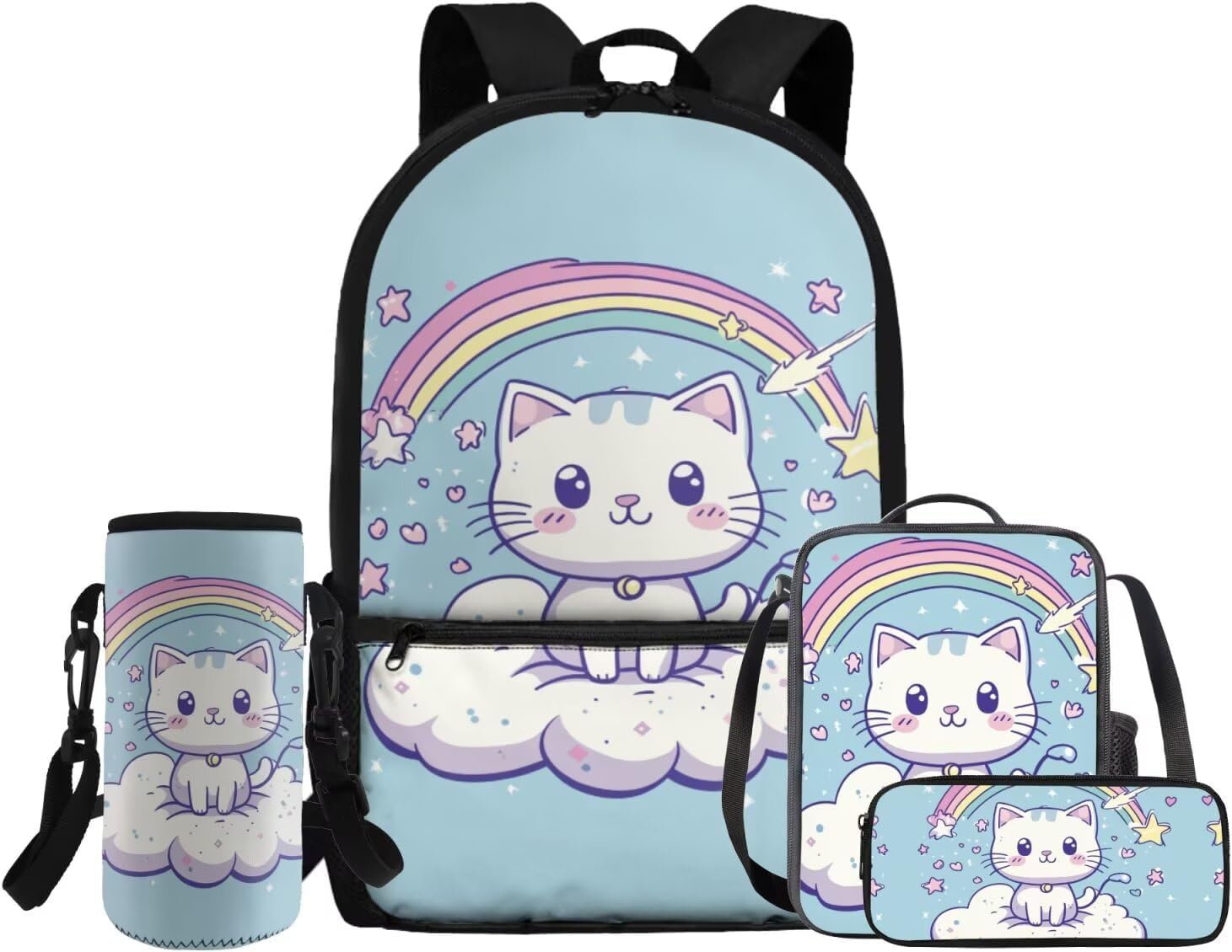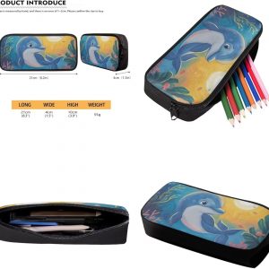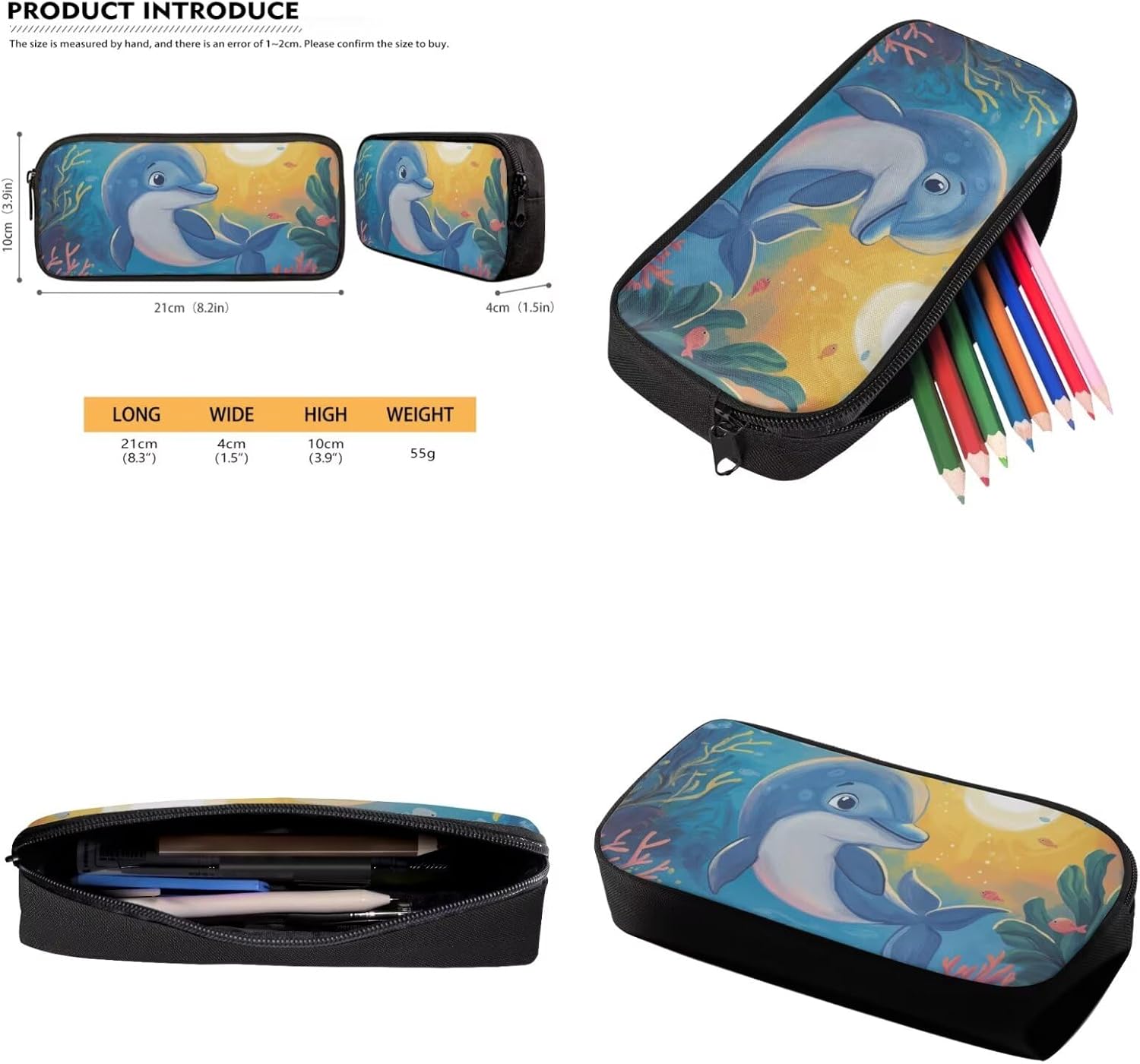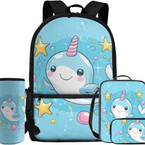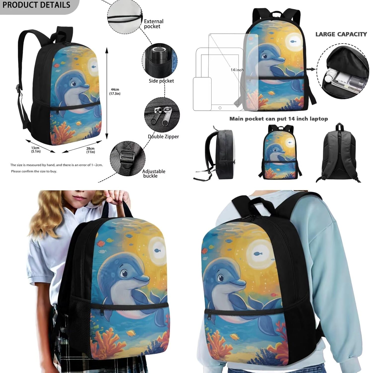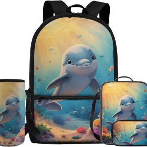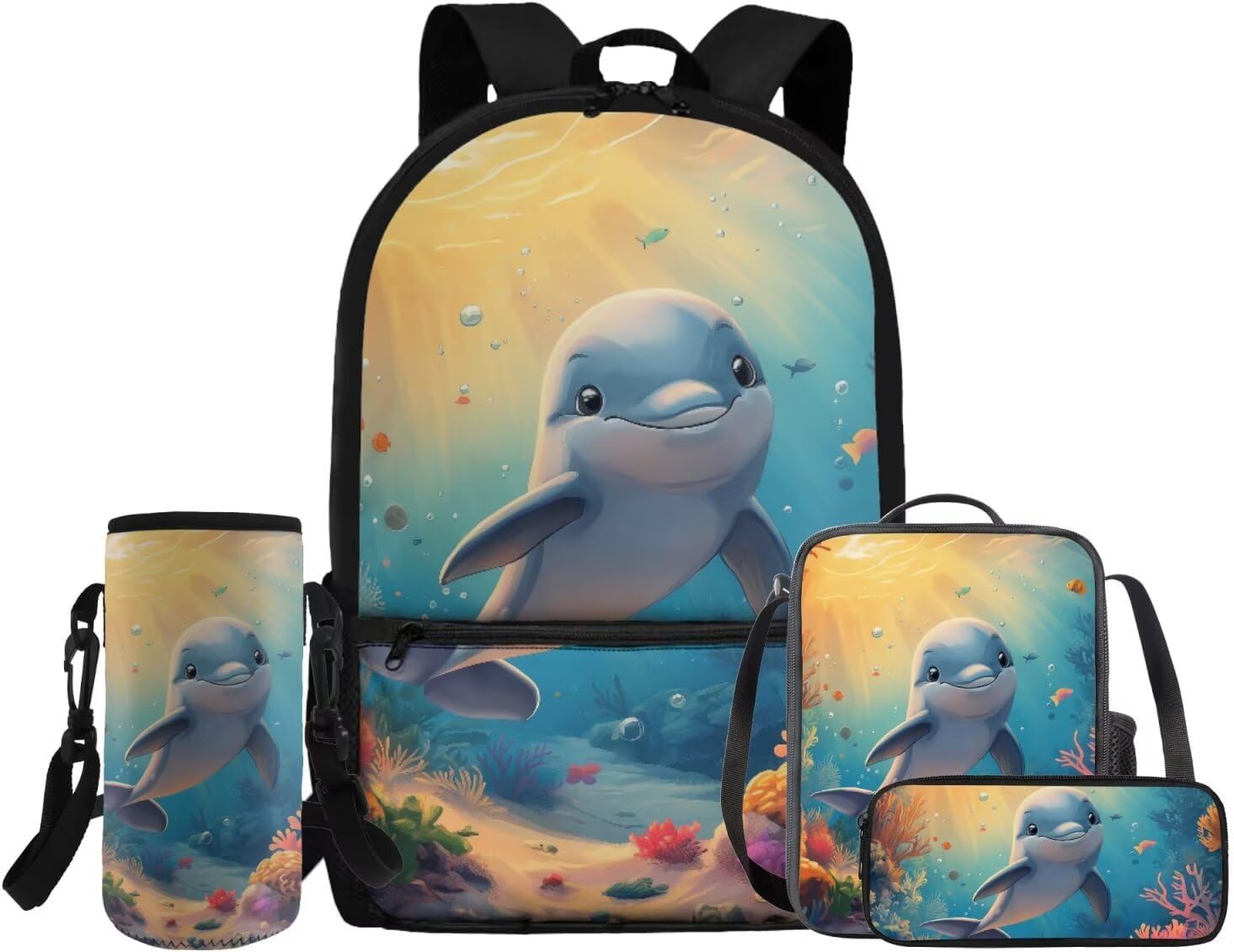 Glorowreny Dolphin Girls Backpack with Lunch Bag Kawaii Kids Lunch Bags for Girls Small Lightweight Water Bottle Sleeves with Strap Set of 4 Classic 17 Inch School Knapsack Book Bags for School