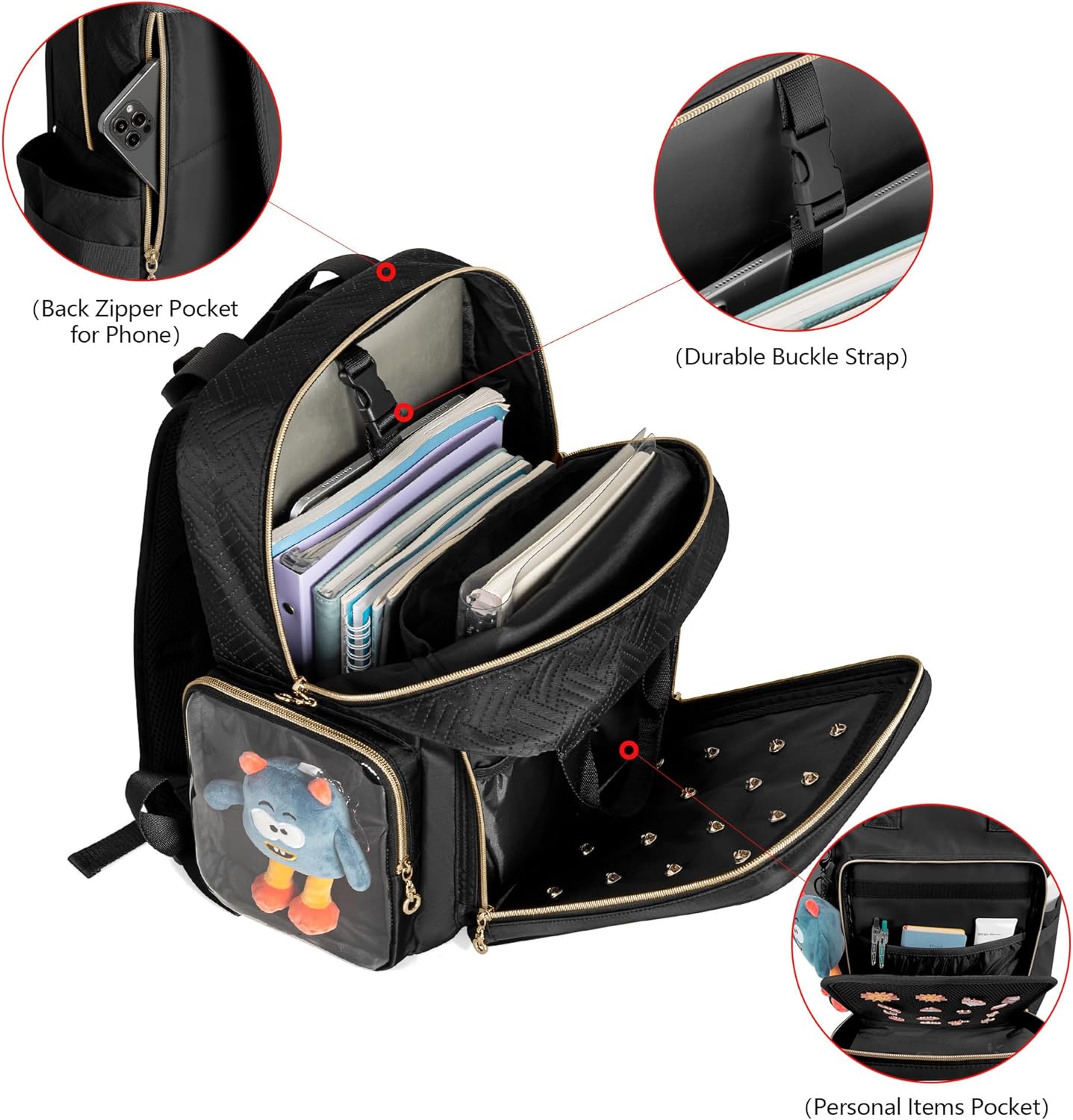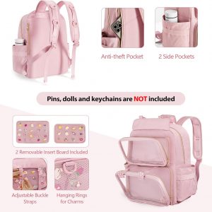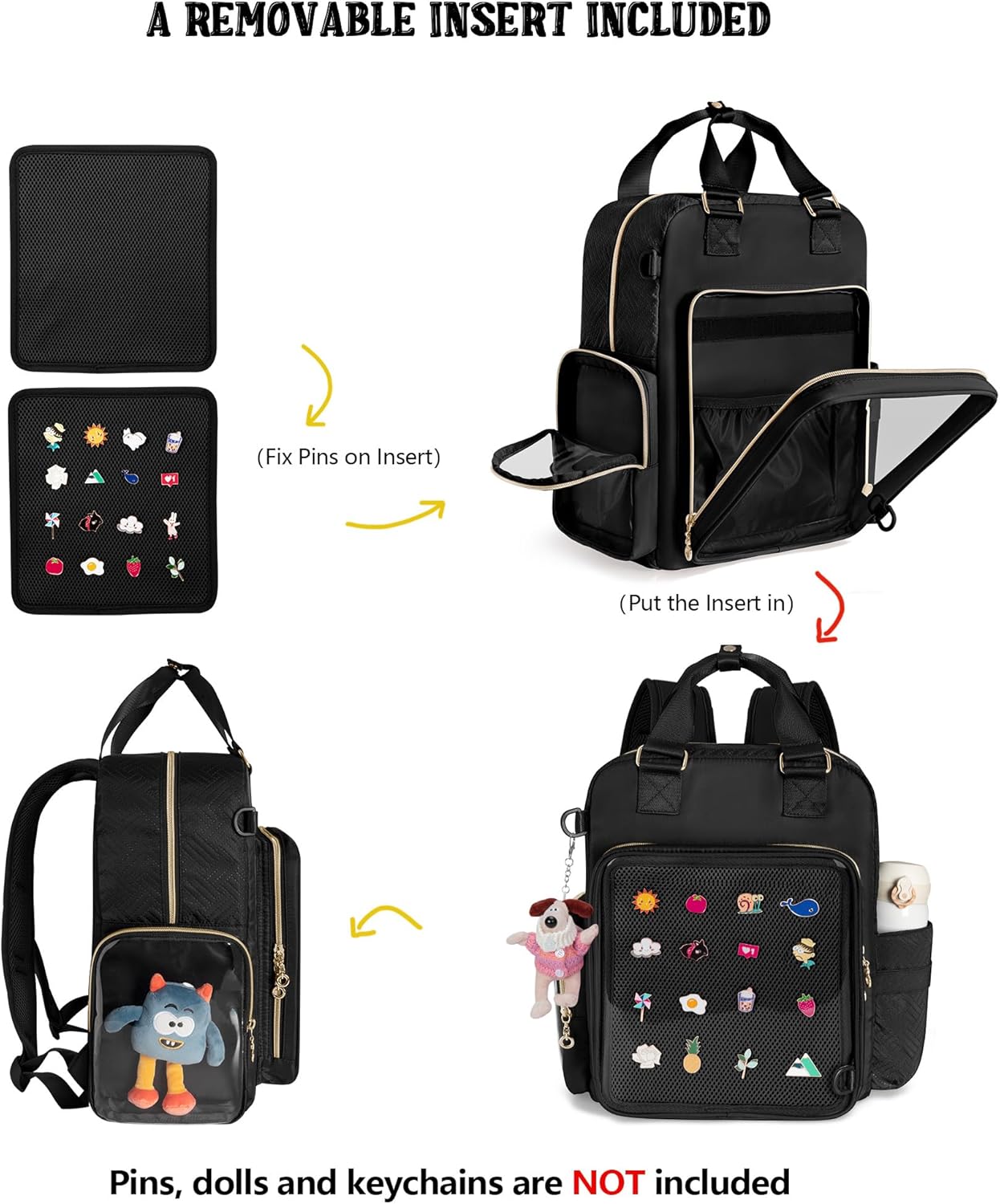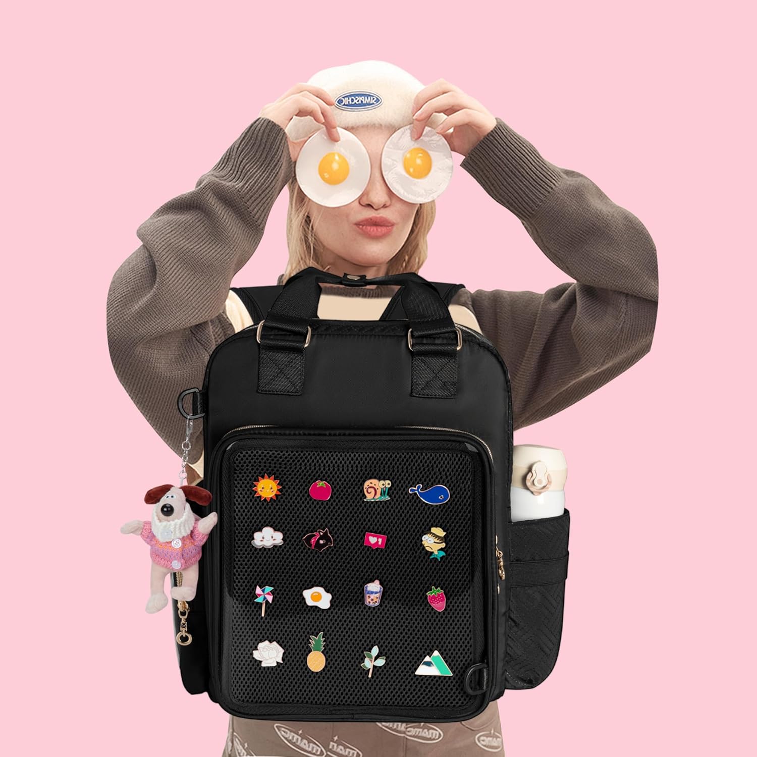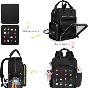 - PIN DISPLAY BACKPACK: Front transparent compartments for displaying anime pins and badges. A padded insert attached for holding the items in place, whose edges are reinforced to maintain its shape. A side zipper pocket with see-through window for showing kawaii dolls. (Empty bag only, NOT includes pins, charms or other accessories.)
