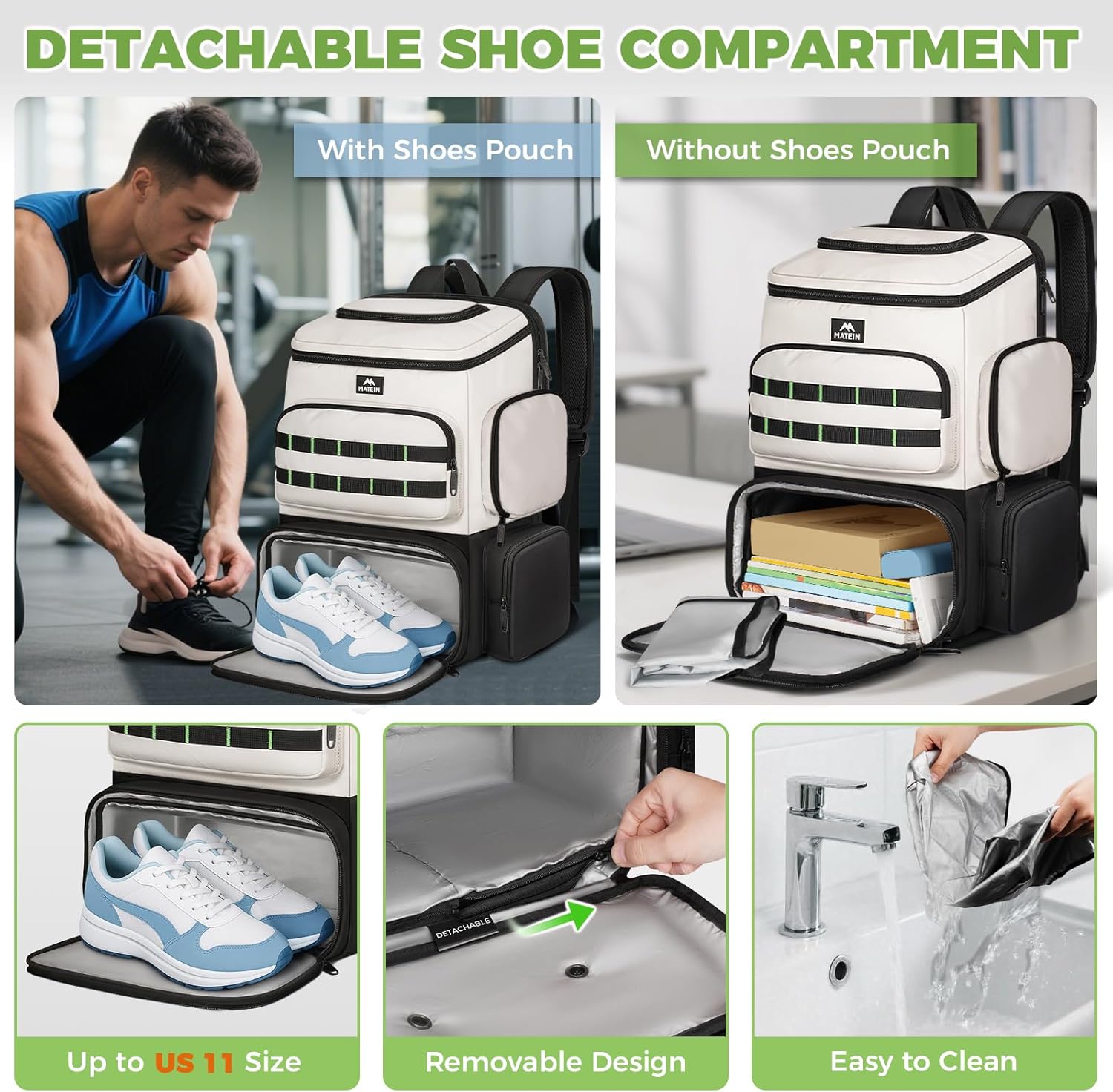 - Dedicated Ventilated Shoe Compartment: Designed with fitness enthusiasts in mind, this gym lunch backpack includes a separate shoe compartment that fits up to Size 11 shoes. Equipped with breathable bottom vents, it ensures proper airflow to keep shoes fresh and dry. The detachable shoe sleeve via zipper offers versatility—easily unzip to clean or use as additional storage when shoes aren’t needed. Whether you're hitting the gym or heading to work, this backpack makes it easy to stay organized