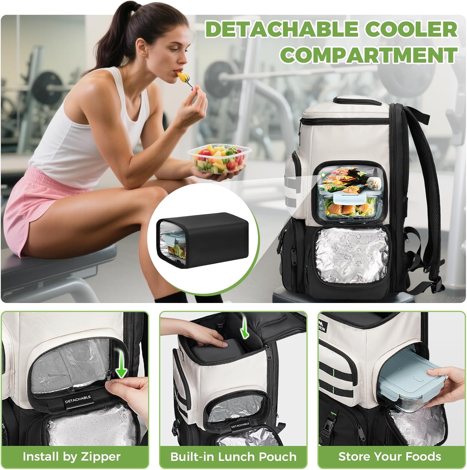 - Detachable Lunch Compartment: This gym backpack for men features a detachable insulated lunch compartment that holds up to 6 cans of soda or 1 lunch box. When not in use, simply unzip to remove it, expanding the main compartment for extra space. An insulated side pocket holds 2 cans of drinks, and the aluminum + padded cotton material keeps food and beverages warm or cool for 4-5 hours. Perfect for work, gym sessions, or on-the-go meals, offering practicality and convenience wherever you are