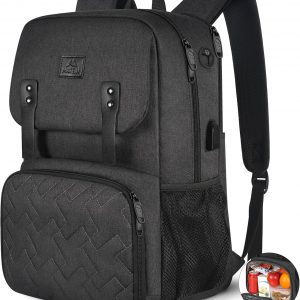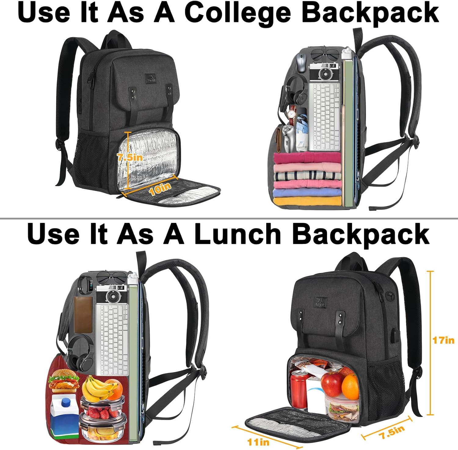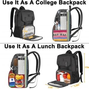 - Insulated Lunch Compartment: Lunch Box Size: 7.5 x 7.5 x 10 inch. With thick insulation pearl cotton and aluminum film lining, lunch compartment of the lunch box backpack not only keeps the food warm but also keeps cold drinks for about 2-4 hours. This college backpack with lunch box is suitable for work meals, picnic meals, outdoor barbecues, food management, travel or shopping