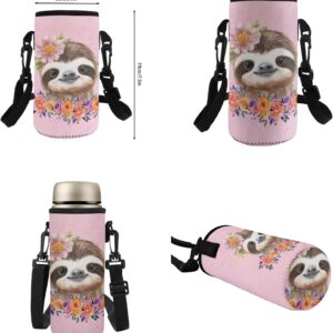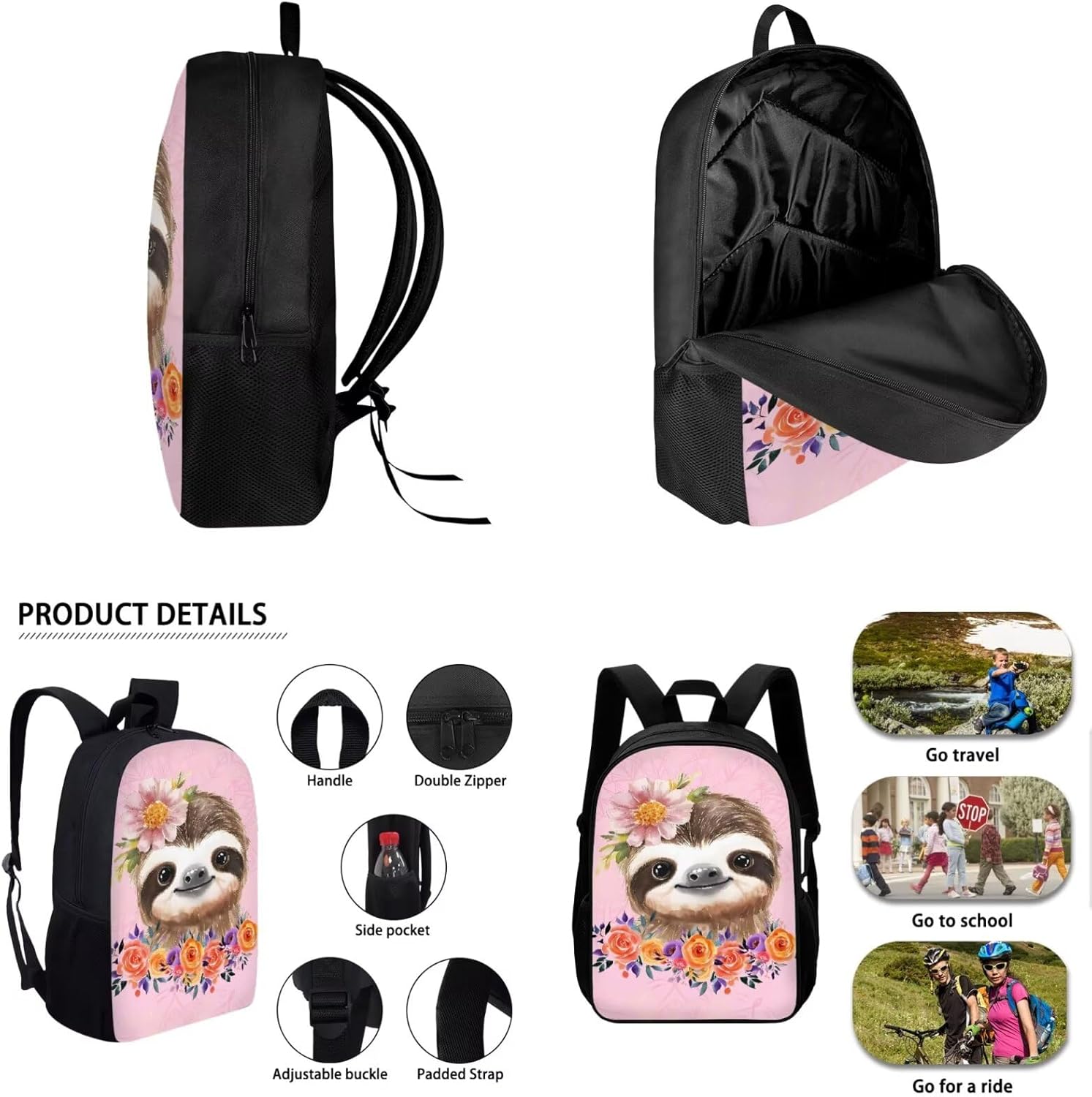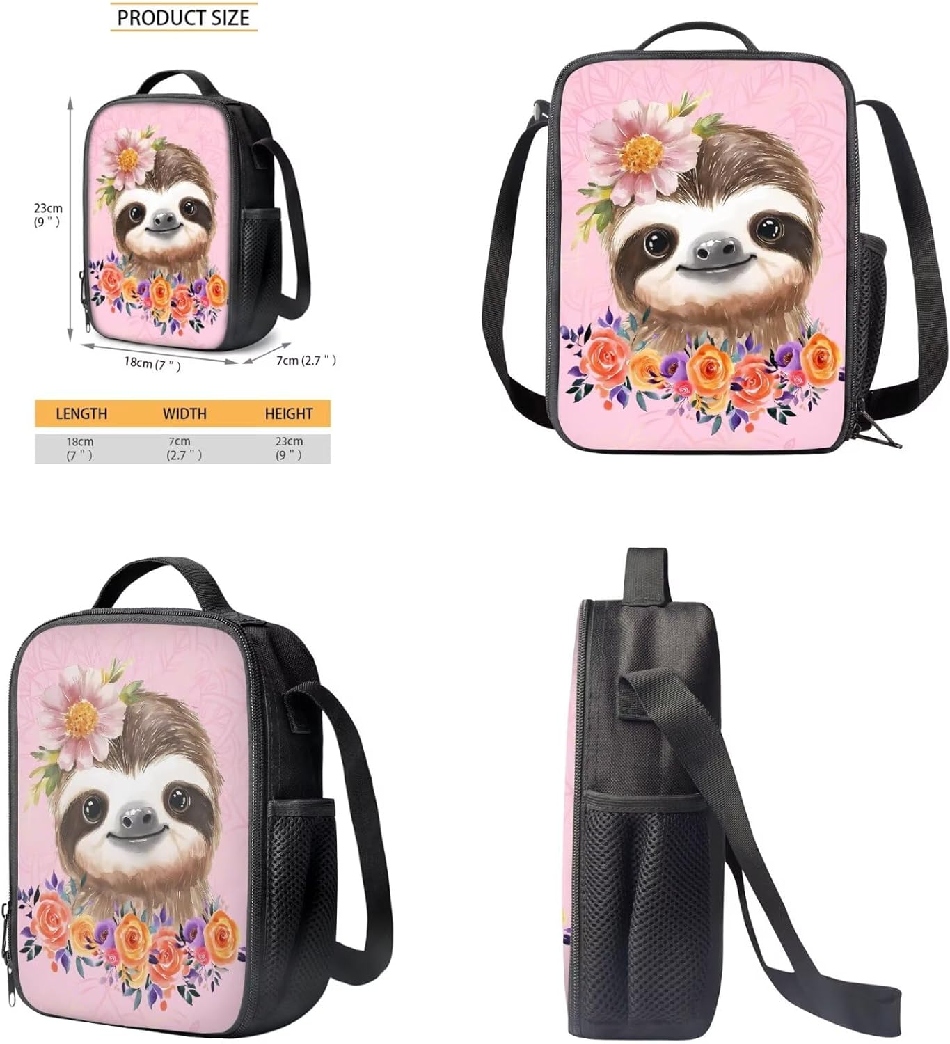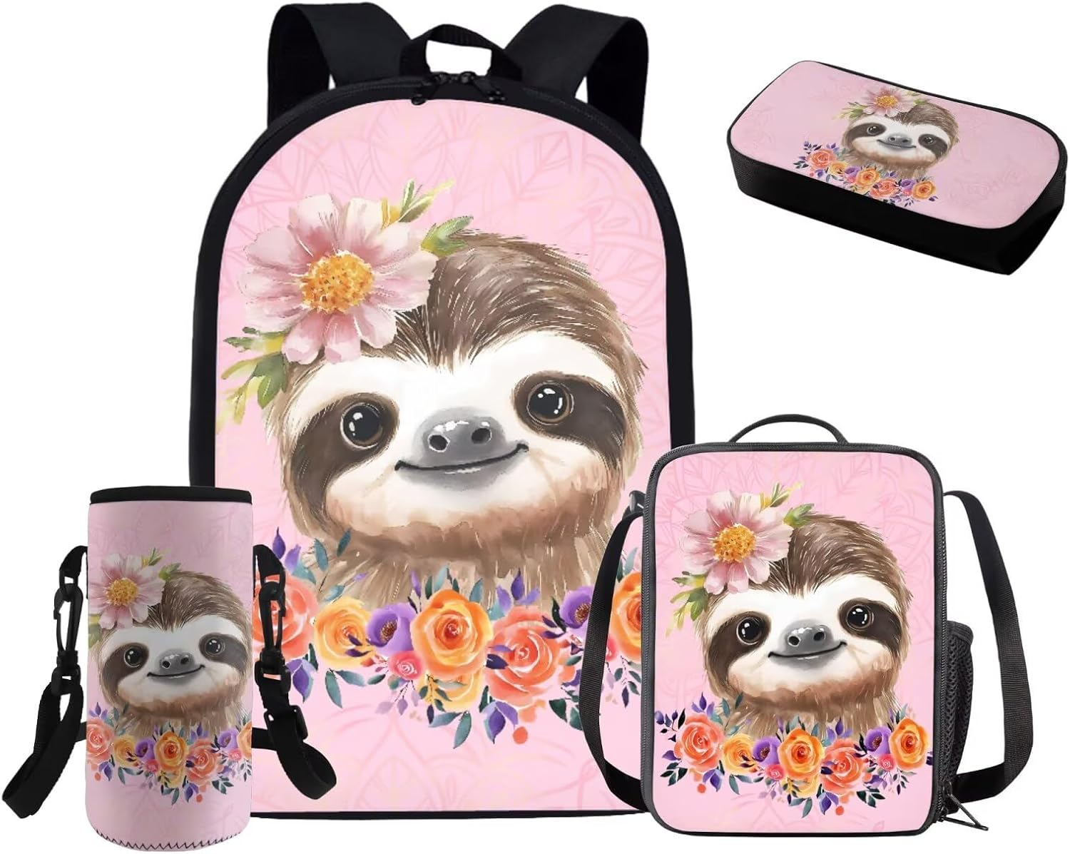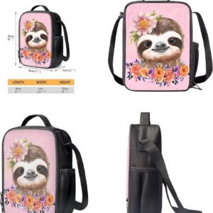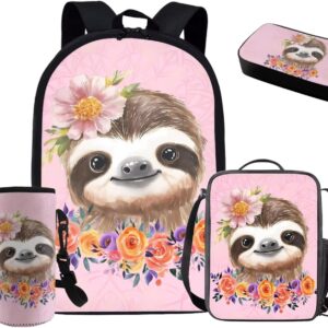 Rnyleeg Flower Sloth Backpack for School Pink Cute Girls Backpack with Lunch Box and Water Bottle Cover 4 in 1 Bookbag Set for Elementary Middle Students Kawaii Bag for School