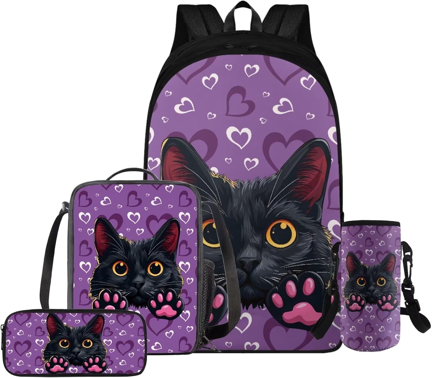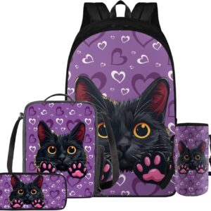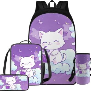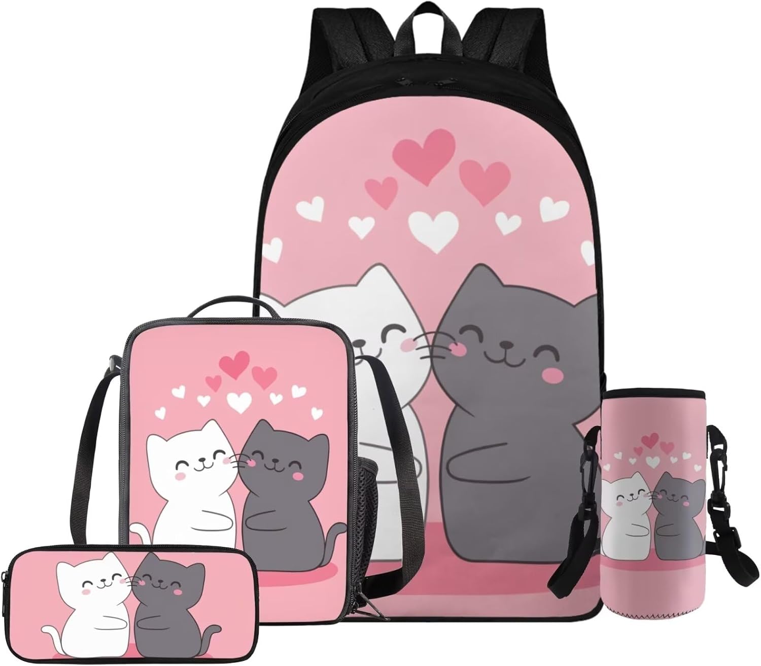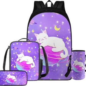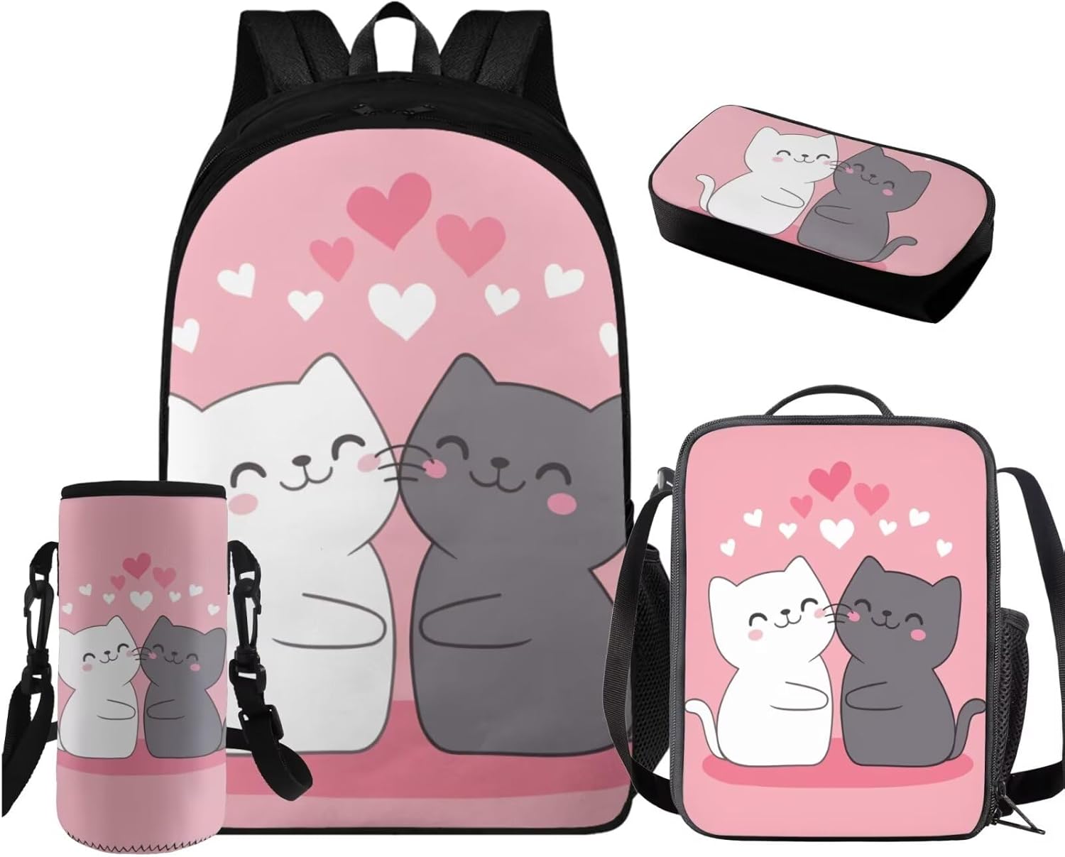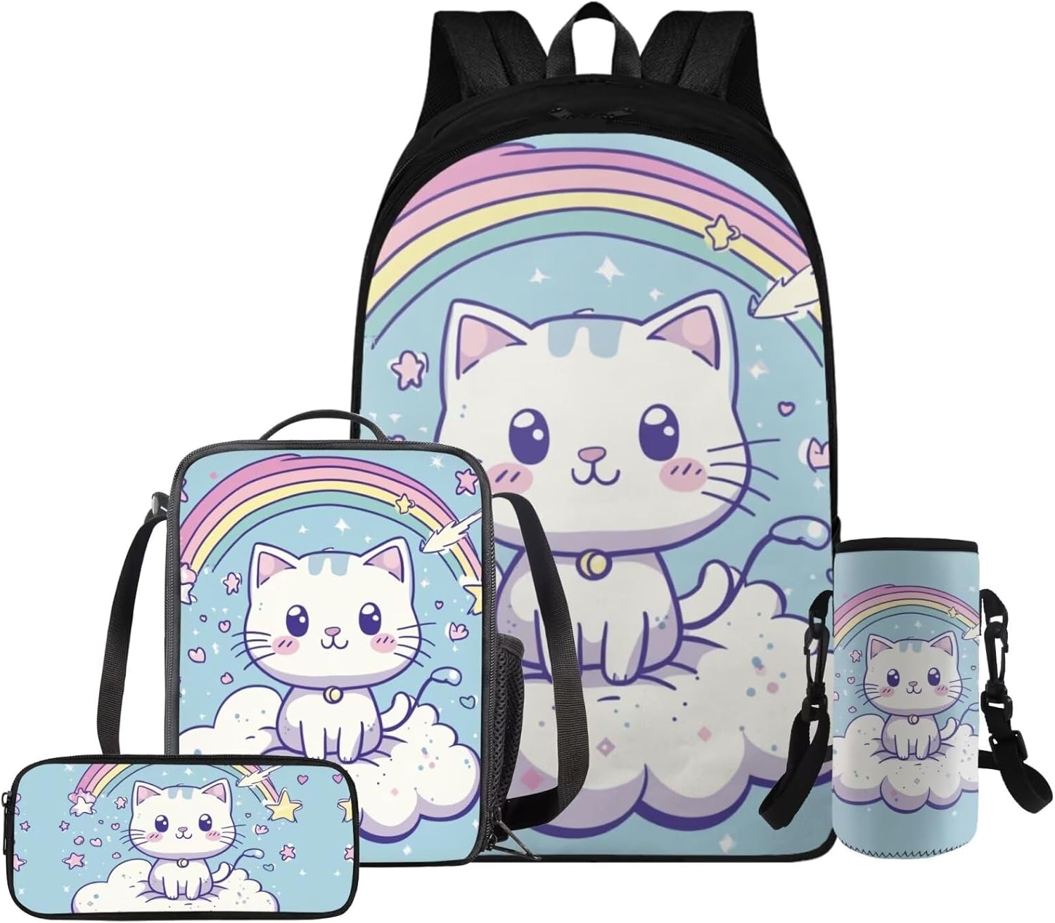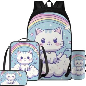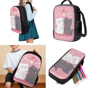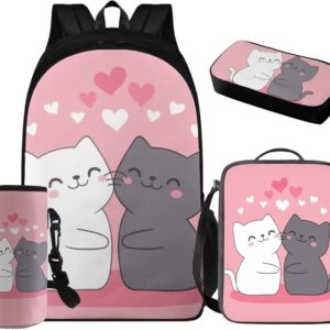 Rnyleeg Pink Cat Backpack for School Girls 9-12 with Lunch Box Kawaii Kids Backpack Set Middle School Bookbag Set 4 in 1 Kids School Bag Rucksack